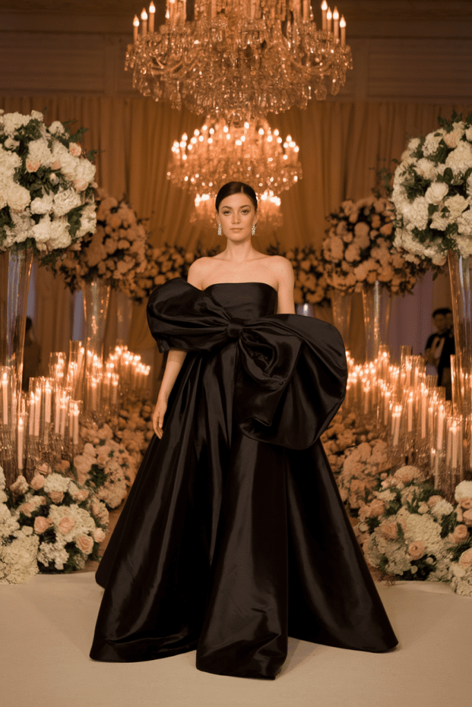 Minimalism meets drama in 2025. A floor-length gown with sculptural detailing (think oversized bow, pleated fan detail, or sharp folds) gives runway vibes without going costume.