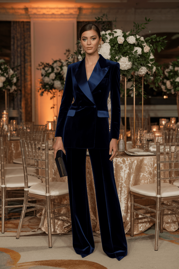 Not in the mood for a dress? A velvet suit with satin lapels or accents is peak 2025 wedding guest energy. Tailored to perfection, it’s powerful and chic.