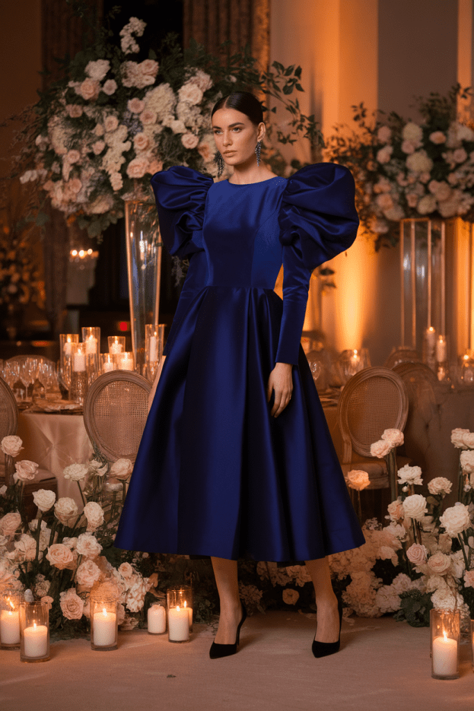 Jewel tones are everywhere in 2025—think sapphire blue, ruby red, and emerald green—but instead of the usual slip or wrap, the standout version is a structured midi with dramatic sleeves. Puffy, ruched, or bell-shaped sleeves turn a classic silhouette into a statement.