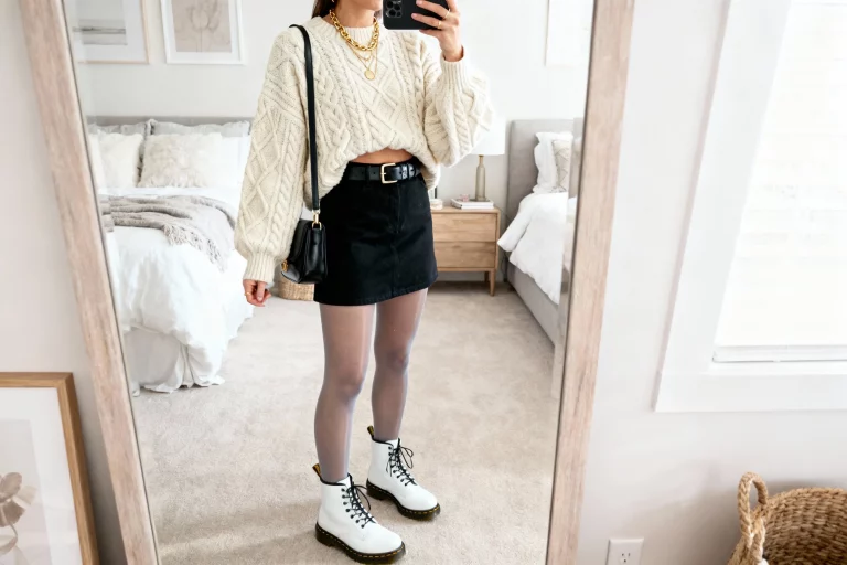 Flirty but warm? Yes, it’s possible. A chunky cable knit and mini skirt with sheer tights gives you that balanced, wintery charm—especially with Docs grounding the whole vibe. It’s playful without feeling precious.