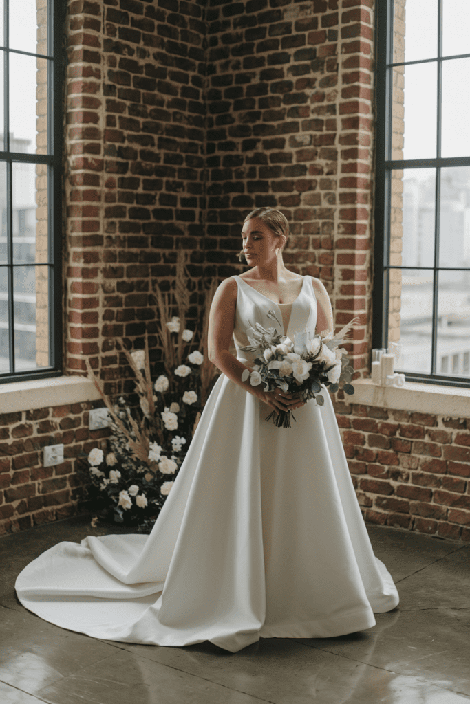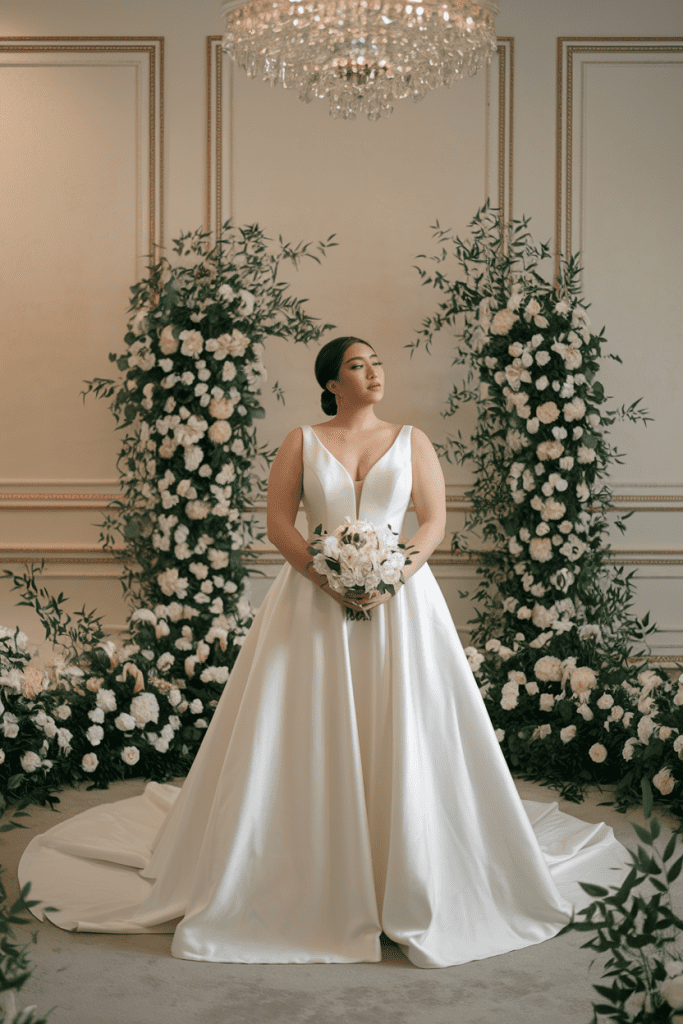 For brides who believe less is more, this gown is ideal. Crafted with high-quality fabrics like mikado or crepe, it focuses on precise tailoring instead of heavy embellishments. The A-line shape provides comfort, while the clean lines create a striking, contemporary silhouette. This gown is versatile and can be dressed up with bold accessories or kept simple for understated chic. Plus size brides love how this style emphasizes confidence and presence rather than ornate details. It feels powerful and refined, perfect for modern weddings in urban settings. The result is a look that embodies quiet strength and sophistication.