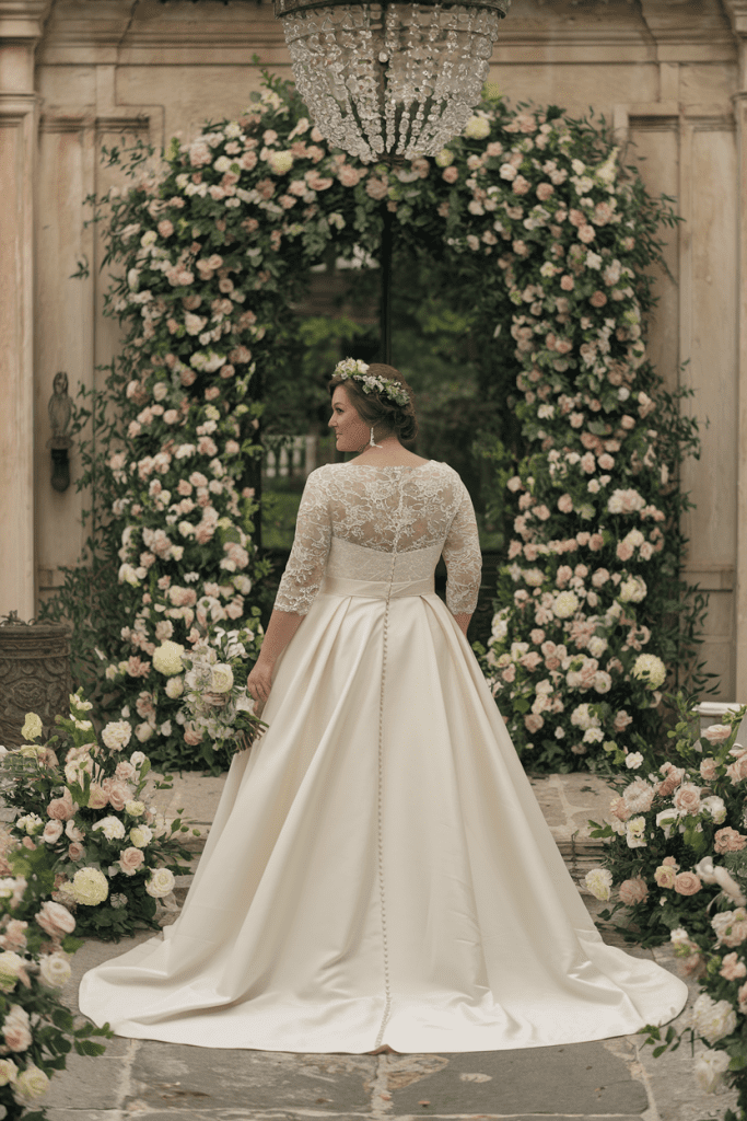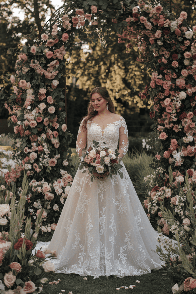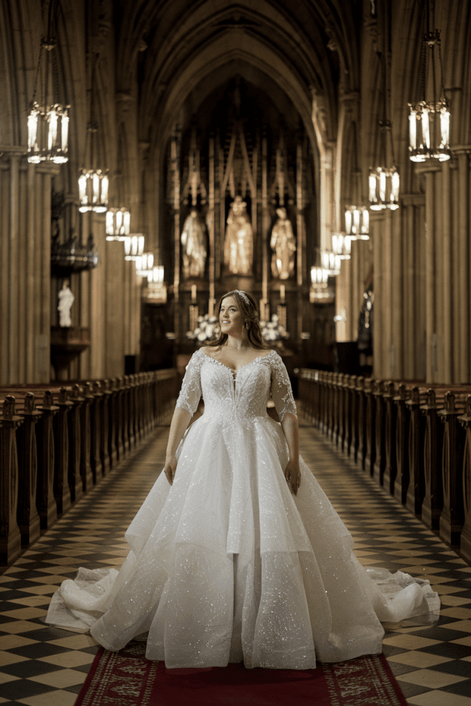 This gown pays tribute to classic bridal fashion while remaining fresh and flattering. Inspired by mid-century elegance, it often features illusion sleeves, buttoned backs, and delicate lacework. The craftsmanship gives the gown character, making it perfect for brides who love timeless romance. Paired with vintage accessories like pearl earrings or a cathedral veil, the look becomes unforgettable. Plus size brides will appreciate how the A-line cut modernizes the vintage details for a flattering fit. It works beautifully in historic venues or outdoor settings with old-world charm. Wearing this gown feels like stepping into history while writing a new love story.