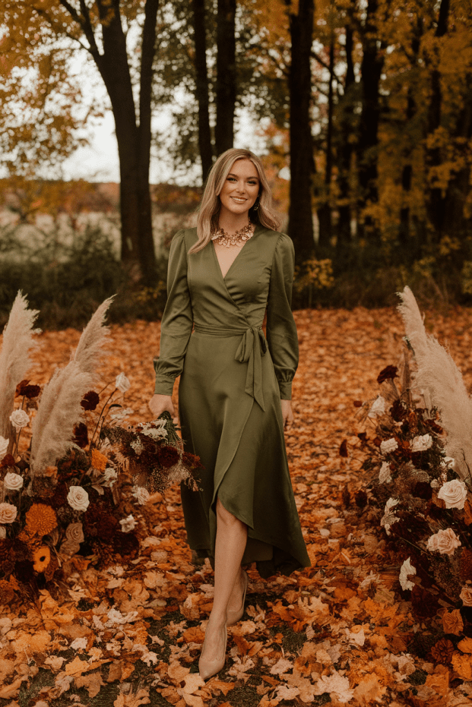 Wrap dresses are flattering on everyone, and olive green is one of fall’s most underrated shades. It feels earthy, elegant, and works in both casual and formal settings.