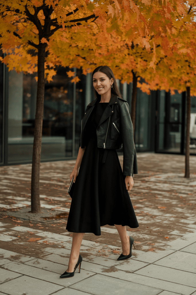 When in doubt, black always works. For fall weddings, elevate a black midi with a cropped jacket — leather, suede, or tweed, depending on the vibe.