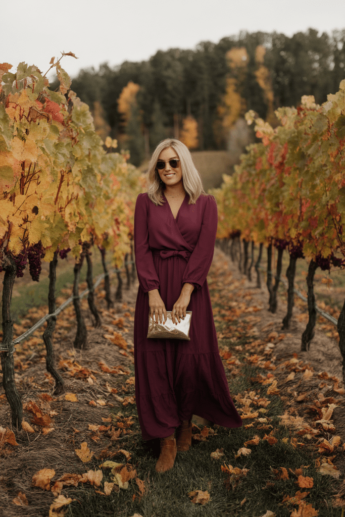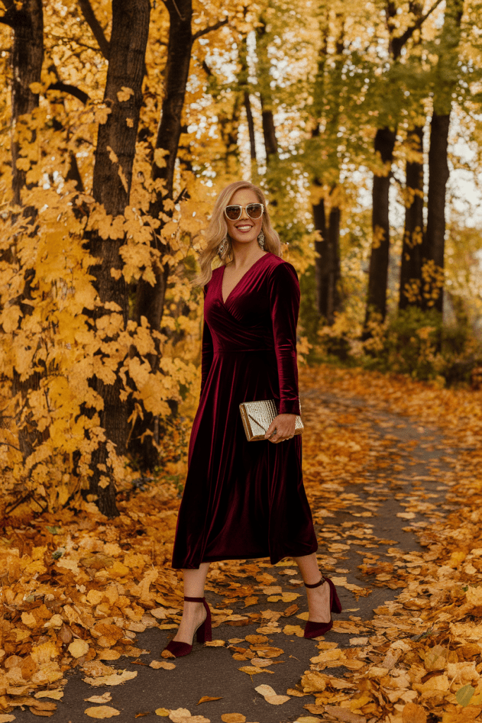 Velvet and fall are basically soulmates. A jewel-toned velvet midi — think burgundy or emerald — looks luxe, feels warm, and photographs beautifully against autumn backdrops.