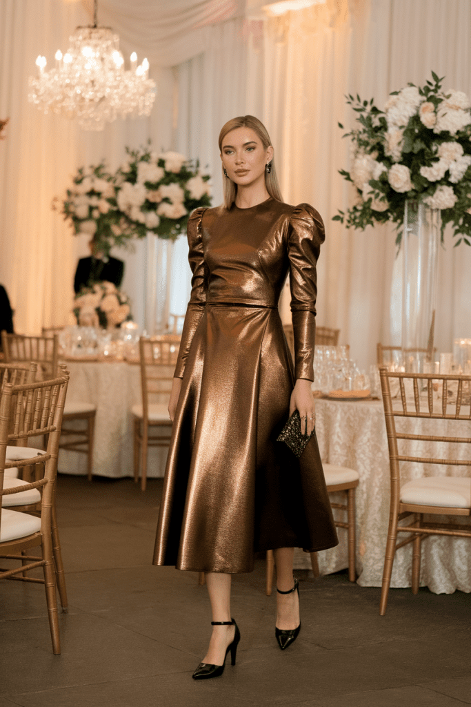Metallic Bronze Cocktail Dress with Minimal Accessories
