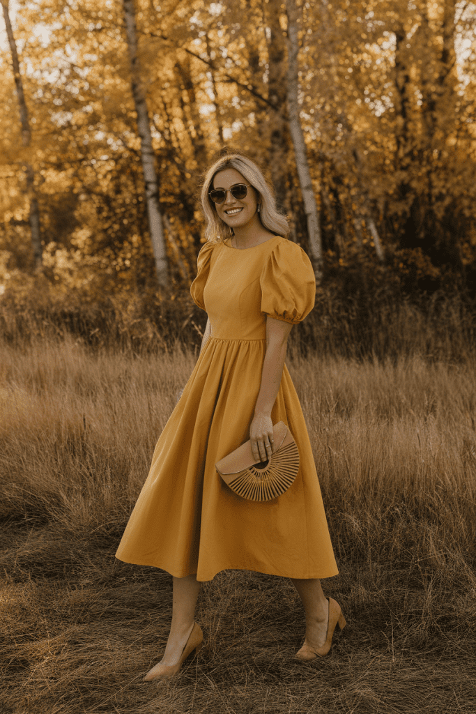 Mustard is bold in the best way and feels so fall-coded. A puff-sleeve midi makes the silhouette dramatic but wearable.