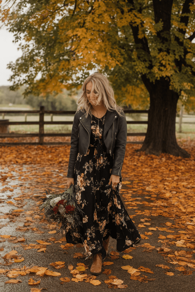 Florals aren’t just for spring. In moody tones like plum, navy, or mustard, they feel perfectly fall-ready. Pairing a flowy floral maxi with a cropped leather jacket balances romantic and edgy.