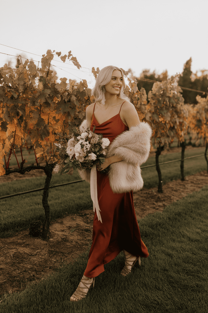 Throw on a shawl or faux fur stole when temps drop. Add strappy heels and you’re set for both ceremony and dance floor.