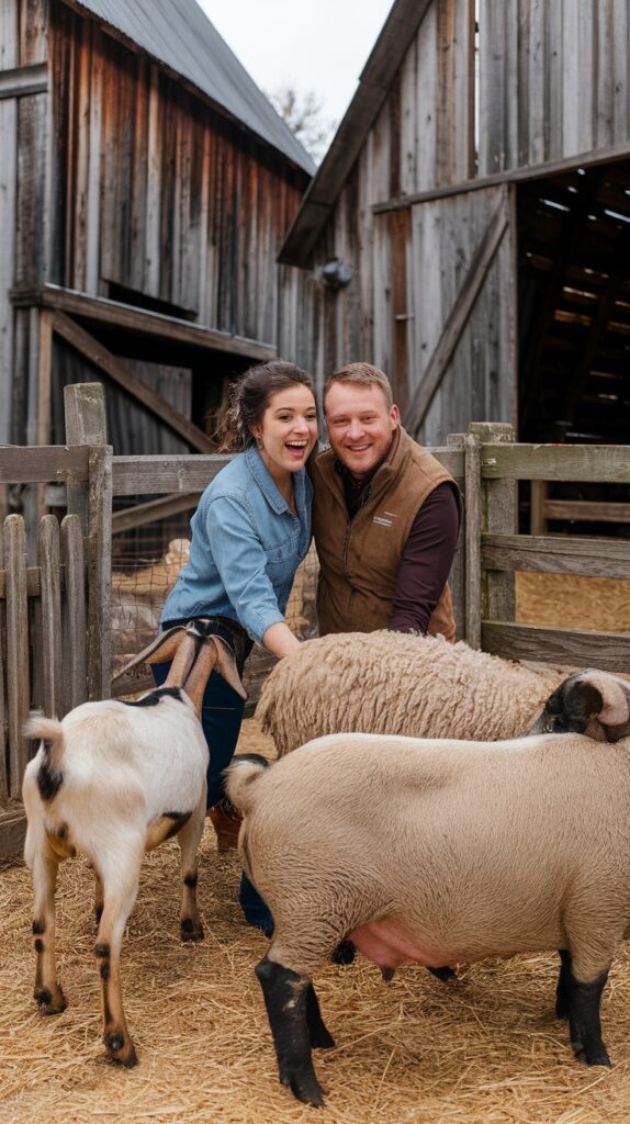 Engagement photos poses at a farm like this can be both relaxed and stylish. Simple moments, like a shared laugh or a gentle embrace, create memories that shine through in every shot. With overlays like “Effortlessly Us” or “Real Love Vibes,” the photos capture the genuine connection between the couple.