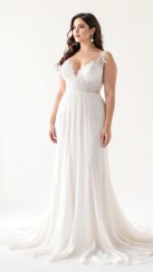 When it comes to accessories, think of flower crowns or delicate jewelry that complements the natural look. Pairing the dress with earthy tones or pastel shades can create a dreamy vibe that’s perfect for any bohemian-themed wedding. For curvy brides, this dress style highlights the waist while allowing room for a flowy skirt that doesn’t cling, making it one of the most flattering wedding gowns for curvy brides in 2025.