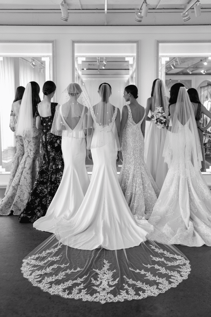 Choosing the right veil is just as important as picking your dress. The image shows a group of bridesmaids showcasing various veil lengths, which helps highlight how each style complements different dress cuts. From the elegant cathedral veil cascading down to the floor to the playful fingertip veil that adds a touch of fun, each option has its own charm.