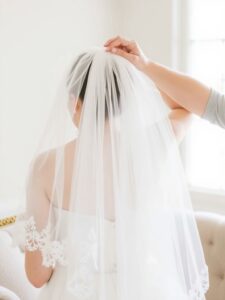 Your personal style and comfort are key. If you love the romantic look of a cathedral veil but worry about managing its length, consider lighter fabrics or shorter options that still give you that dreamy vibe. In this bridal veil style guide, remember to choose what feels right for you. Whether it’s a fingertip veil for a beach ceremony or a birdcage for an intimate celebration, your veil should reflect your personality while enhancing your overall look.