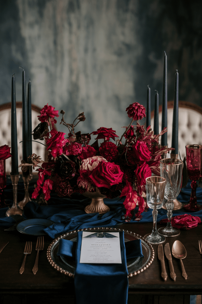 This one’s bold, dramatic, and not for the faint of heart—but wow, it works. Navy grounds the palette, while fuchsia adds energy and personality. Perfect for couples who want something edgy yet elegant.