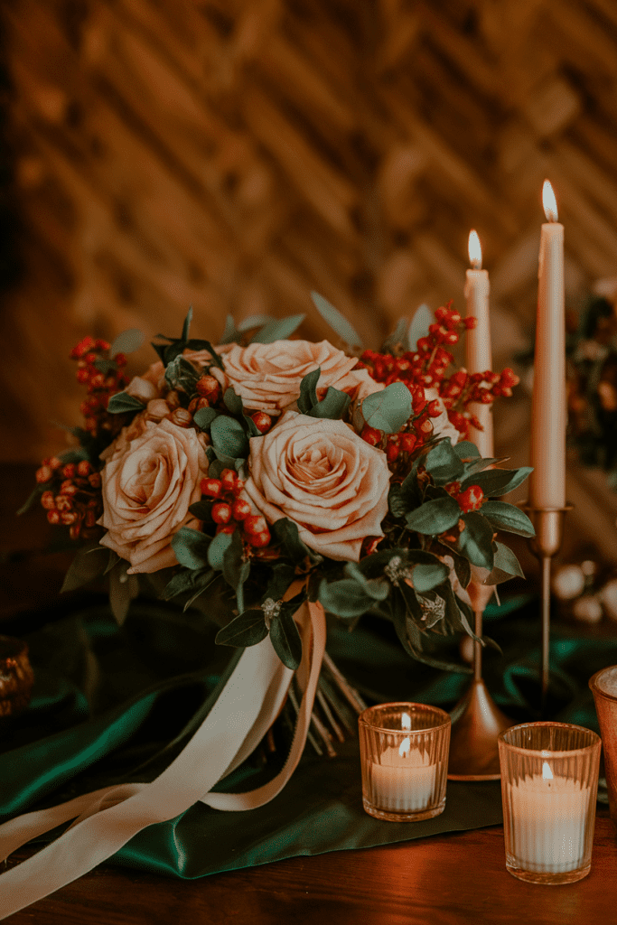 Styling tip: This palette shines in florals—think peach roses with emerald greenery.