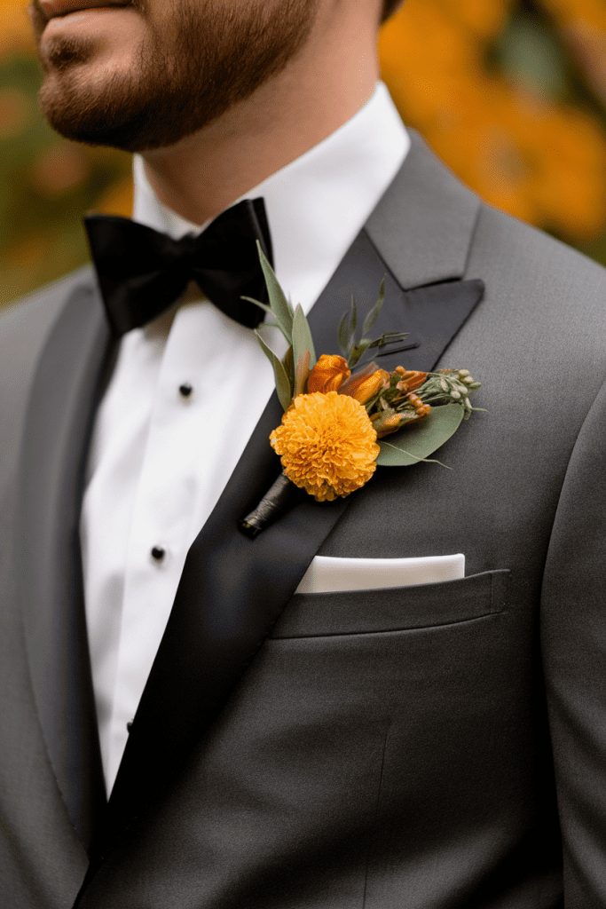 Styling tip: Slate gray suits with marigold boutonnieres? Absolute perfection.