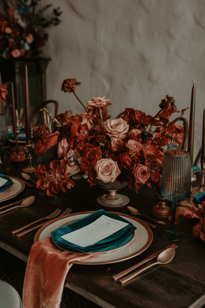 This duo is rich, unexpected, and oh-so-photogenic. Teal gives modern energy, while burnt sienna keeps it grounded in autumn tones. Together, they’re chic and dramatic.