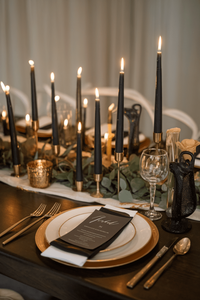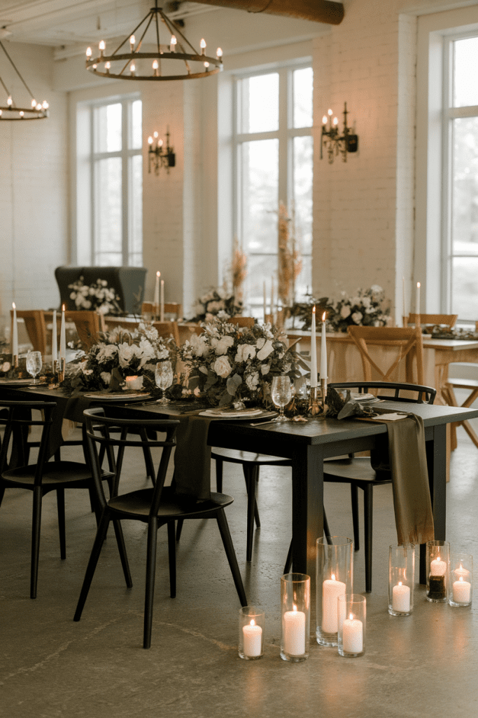 Styling tip: Keep florals minimal (white roses or greenery-heavy arrangements) to balance the palette.