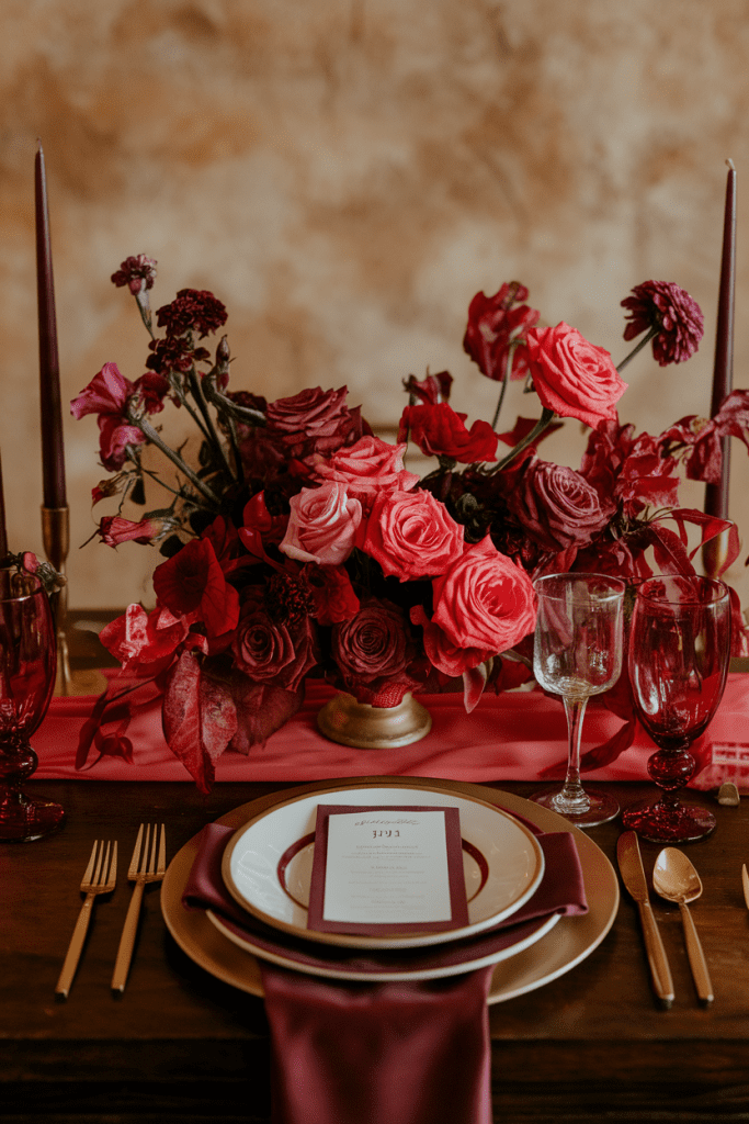 Styling tip: Use coral in smaller accents—like boutonnieres or cocktails—so plum remains the anchor.