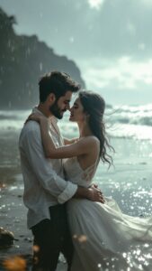 For your own creative couples shoot, consider this idea. You can dress in flowy outfits that catch the light and create movement, adding an extra layer of beauty to the scene. The reflections on the wet sand add depth and intrigue, making each image pop.