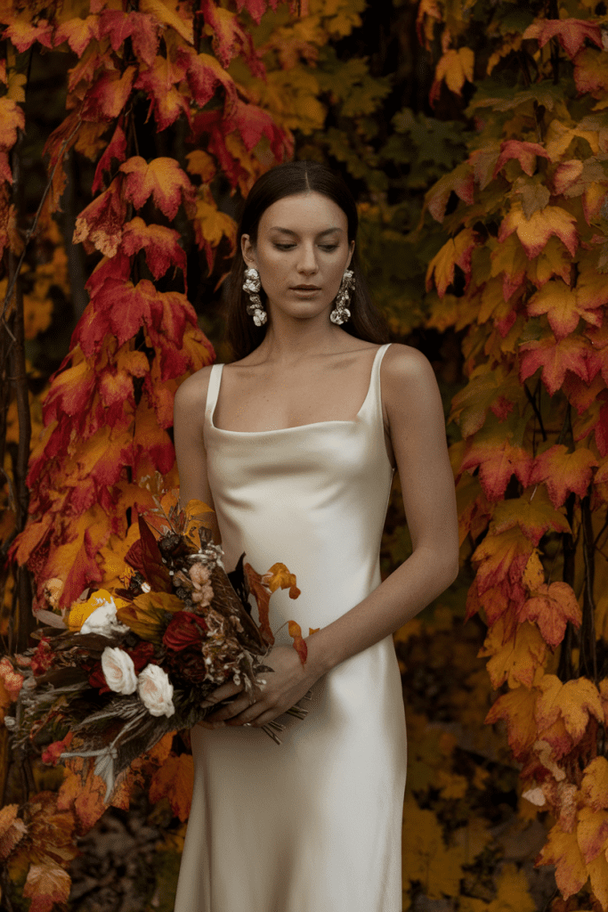 Fall brides are embracing sleek gowns: slip dresses, clean satin silhouettes, and dramatic square necklines. Add long sleeves for autumn warmth, and you’re basically runway-ready.