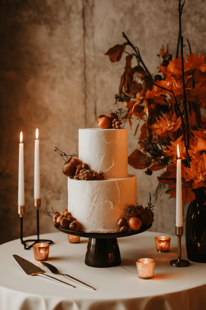 Minimal doesn’t mean plain vanilla. Cakes with smooth buttercream, subtle textures, or single-color detailing are trending. Add fall flavor (like spiced apple or pumpkin layers), and suddenly you’re minimalist and seasonal.
