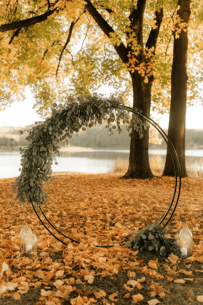 Over-the-top floral arches are cute, but minimalist fall weddings lean toward sleek wooden frames, circular metal arches, or greenery-only designs. It frames the vows without stealing the show.