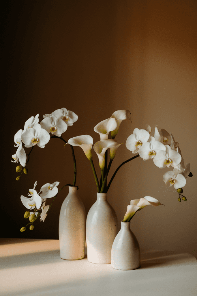 Instead of overstuffed bouquets, minimalist fall weddings go for clean, sculptural arrangements. Think orchids, calla lilies, or branches styled in sleek vases. Less is more, but it’s still stunning.