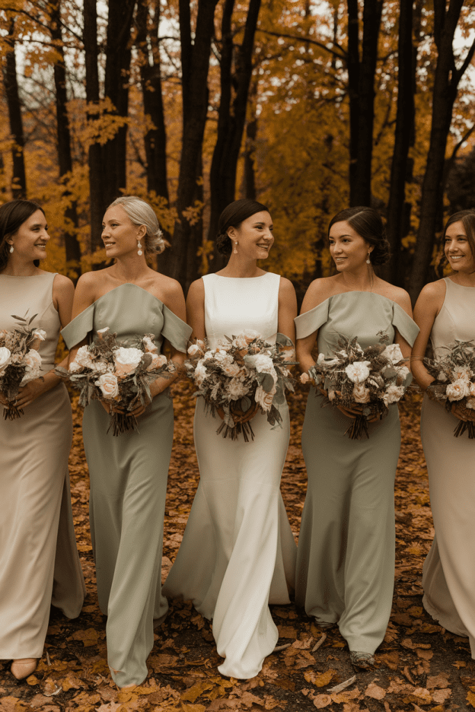 Forget mismatched rainbow palettes. Bridesmaids in monochrome—like all sage, all champagne, or all black—look modern and effortless. The photos? Insanely chic.