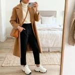 - Let the turtleneck fit close to the body for contrast with the voluminous coat.