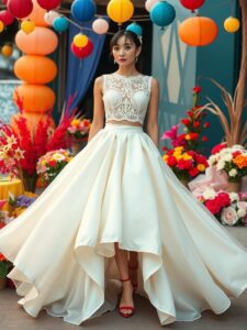 Fabrics play a key role in achieving that playful bridal look. Lightweight materials like chiffon and lace enhance the dress’s elegance while keeping it fun. To complete the outfit, consider accessorizing with dainty jewelry and a pair of stylish flats or wedges. This creates a carefree yet polished appearance, perfect for any celebration.