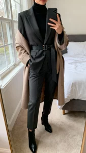 - Go tonal: charcoal suit, graphite puffer, black boots for a cohesive look.