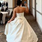A corset bodice adds structure, while pearls soften the silhouette with a touch of whimsy. It’s fashion-forward romance in one look.