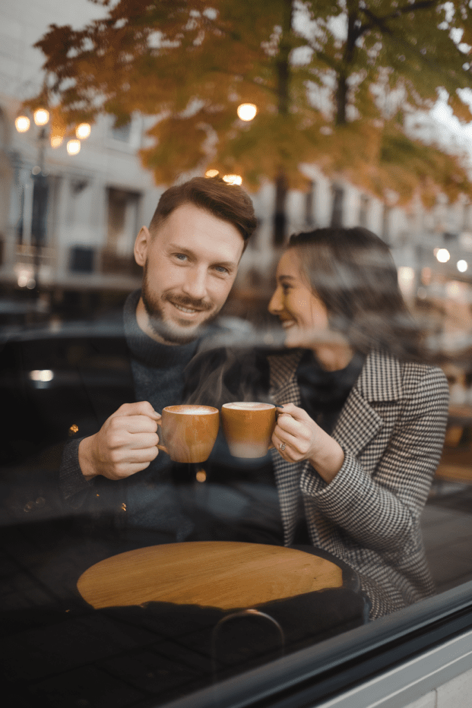 Not every fall engagement photo has to be outdoors. Find a café with steamy windows and warm lighting, grab lattes, and let your photographer shoot candids through the glass.