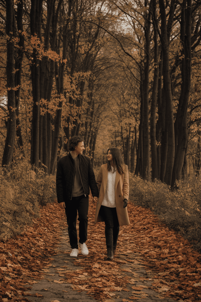 Few setups are as cinematic as walking down a leaf-covered path. Hand-in-hand, side glances, maybe even a cheeky spin—it all looks effortlessly romantic.