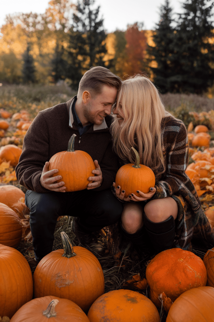 The key here is avoiding awkward “posed with a giant pumpkin” vibes. Instead, interact naturally—sit on hay bales, carry smaller pumpkins, or laugh while trying to pick the biggest one.