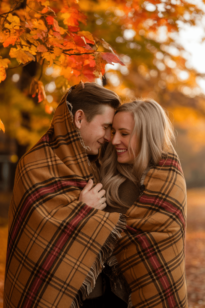 You knew this one was coming. Nothing says fall engagement session like sharing one oversized blanket and pretending the photographer just “caught you” cuddling. It’s low-effort but ridiculously photogenic.