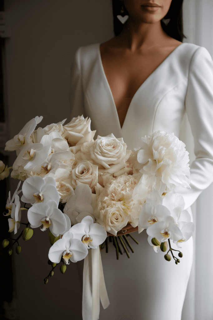 Layer different white blooms—peonies, roses, orchids—for a textured yet monochrome vibe.