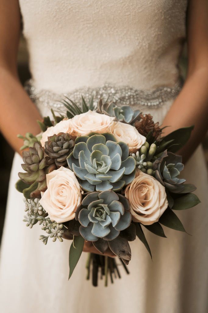 Succulents add a modern, earthy touch when paired with roses. Perfect for desert or rustic venues.