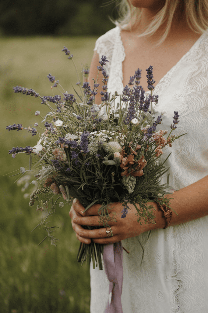 For boho brides, lavender sprigs mixed with wildflowers create a bouquet that feels freshly picked from a meadow.