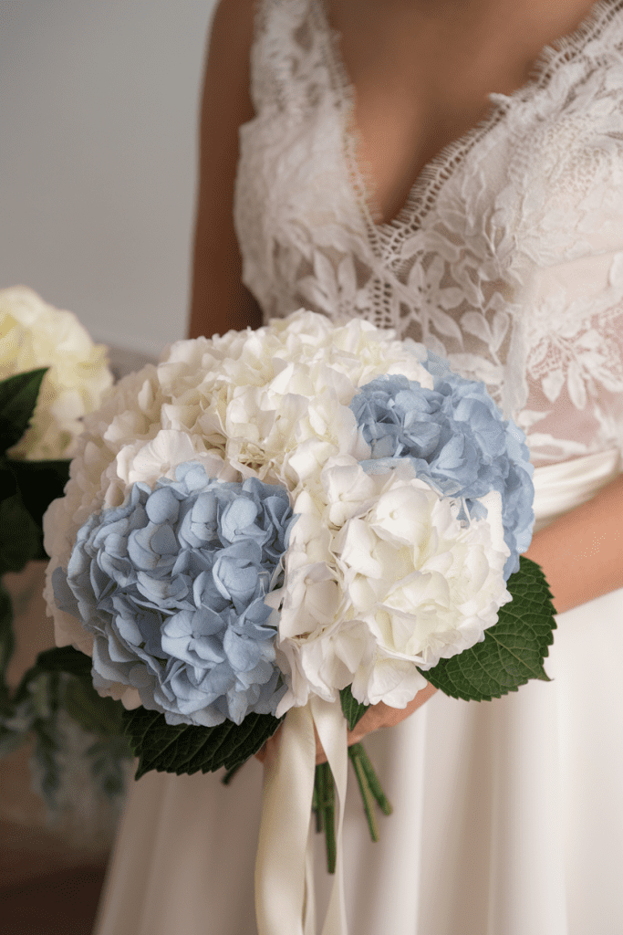 Hydrangeas bring fullness and softness. White or blue hydrangeas look dreamy in summer, while deep purple works for fall.