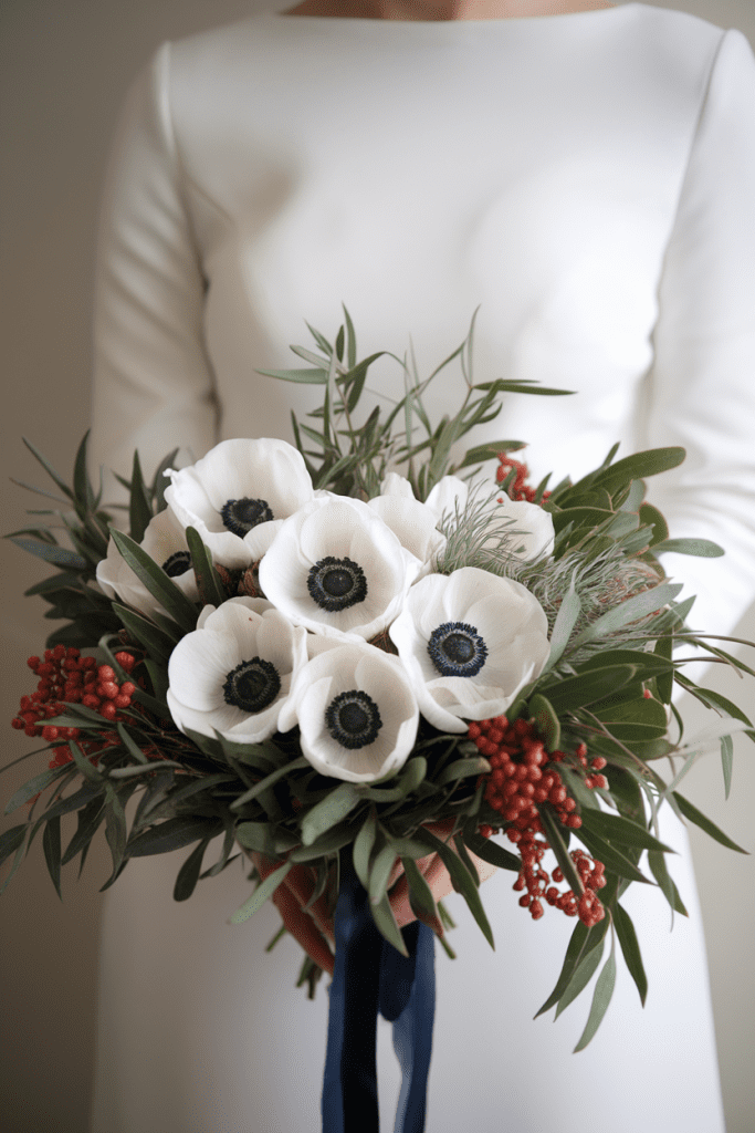 White anemones with black centers feel chic and editorial. Add dusty greenery or white ranunculus for texture.
