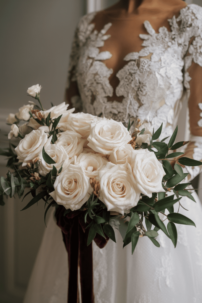 Nothing beats white roses for timeless elegance. But when you pair them with textured greenery or swap the standard ribbon for velvet, they suddenly feel fresh and modern.