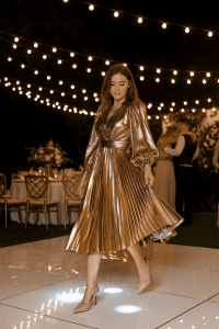 Shiny, flowy, dramatic—yes please. A metallic pleated gown moves like a dream when you’re twirling on the dance floor. Go silver or gold depending on your jewelry game.