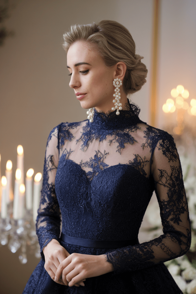 Lace in winter is underrated. A high-neck lace gown in navy or black gives romance without feeling too bridal.