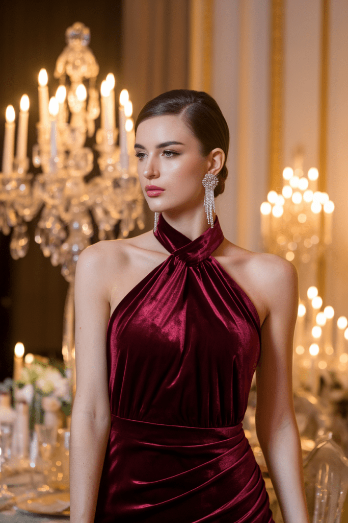 Halter cuts always feel statuesque. A velvet halter midi combines structure with lush texture.