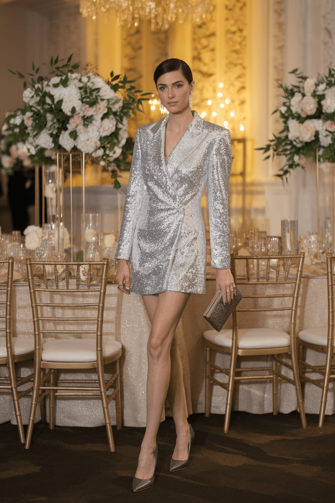 Who says cocktail attire has to be feminine-only? A sequin blazer dress gives structure with sparkle.