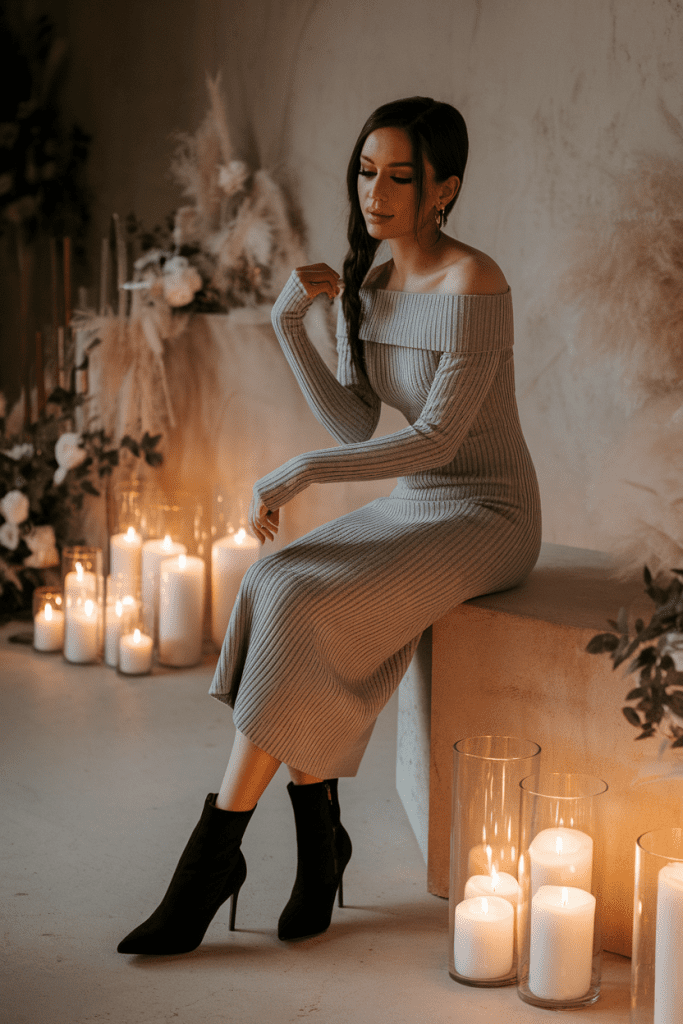 Yes, a knit dress at a wedding—but hear me out. A fitted off-shoulder ribbed knit midi feels cozy, chic, and unexpectedly sexy.