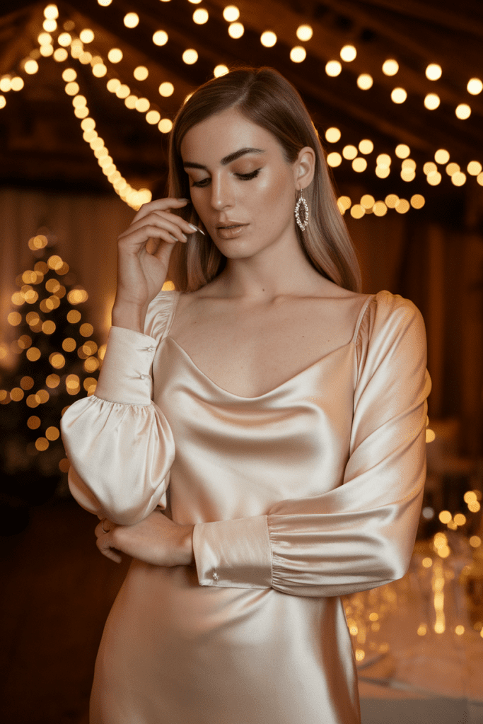 Everyone knows the slip dress, but add sleeves and suddenly it’s winter-approved. A long-sleeve satin slip keeps the sultry vibe while making sense for cold weather.