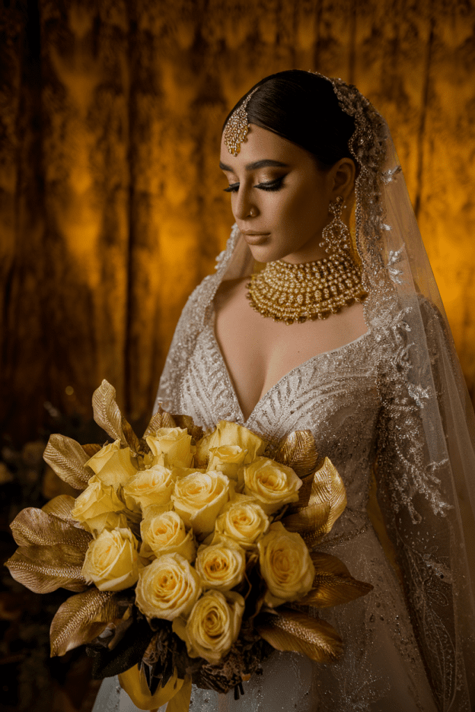 For the glam bride, yellow flowers with metallic gold accents feel luxe and unforgettable. Think gilded leaves paired with roses or orchids.